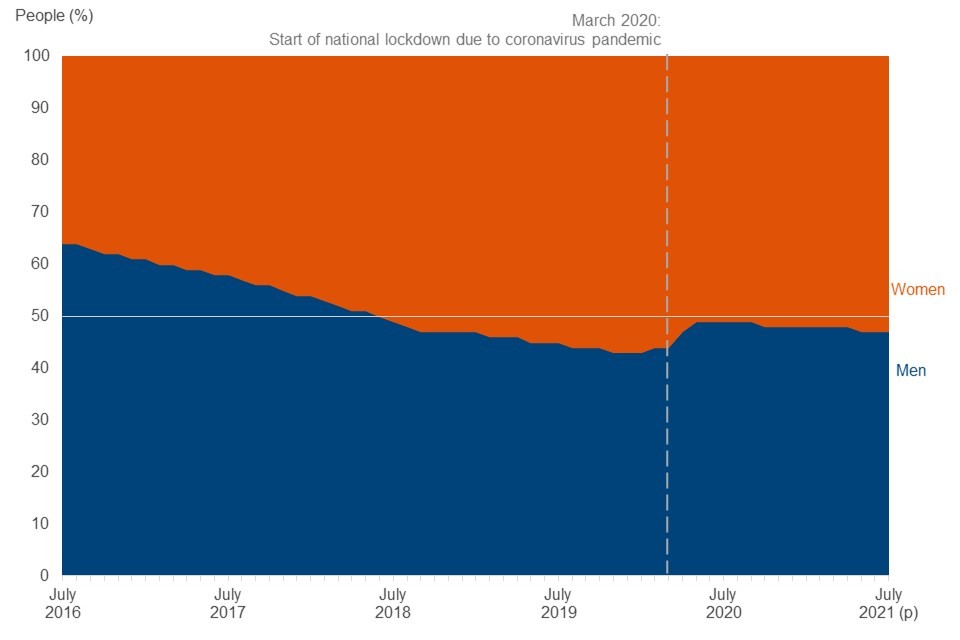 People on Universal Credit by gender, Great Britain, July 2016 to July 2021