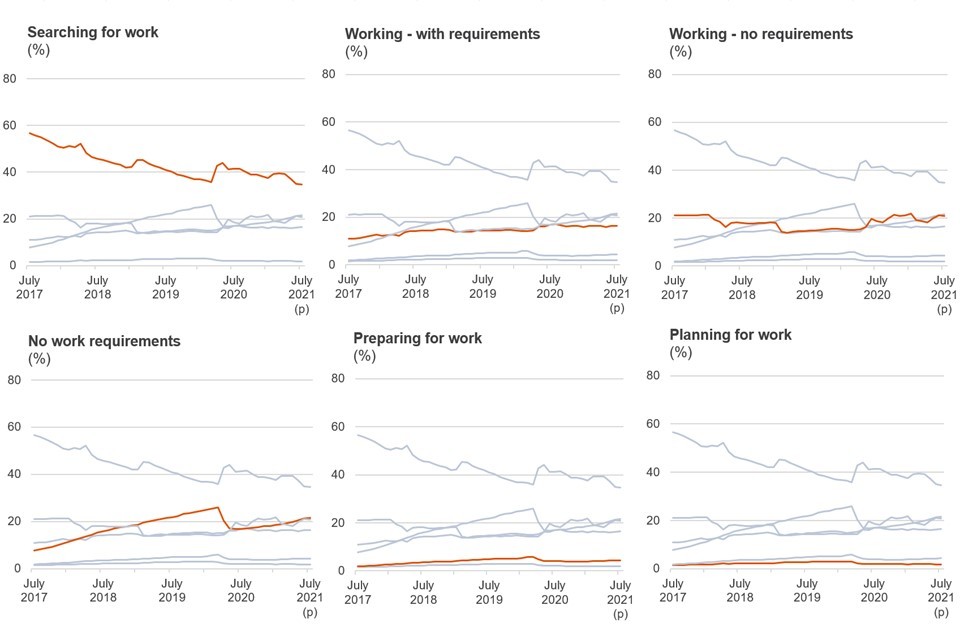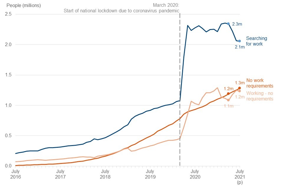 The number of people on Universal Credit who were not working or on low earnings and required to search for work as a condition of their claim (‘searching for work’) has fallen by 280,000 to 2.1 million (35% of all people on Universal Credit) in July 2021 from 2.3 million (39% of all people on Universal Credit) in April 2021.