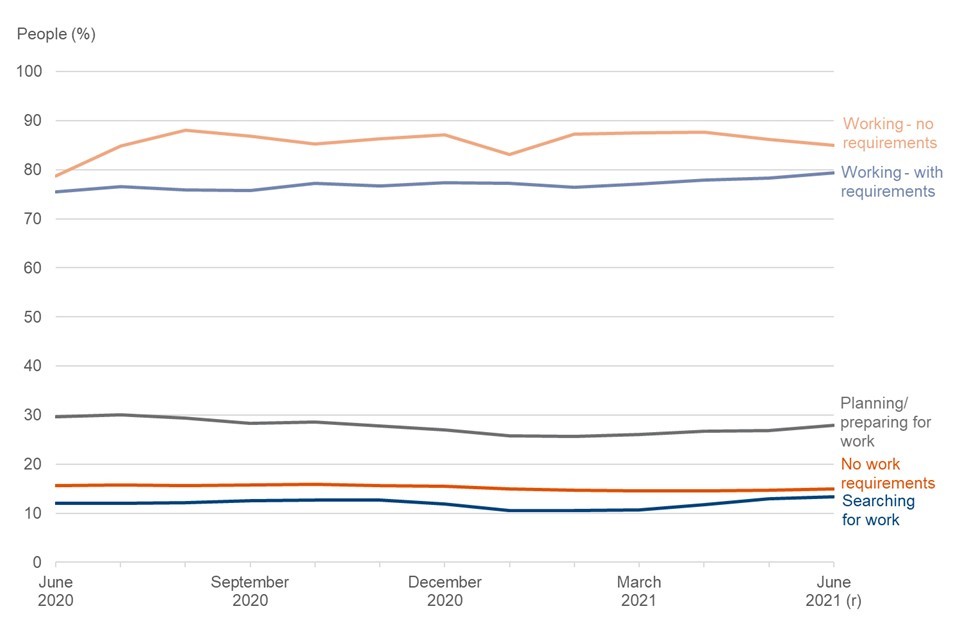 Over the same period, the number of people on Universal Credit whose circumstances mean they have no requirements to work (‘no work requirements’) has risen by 95,000 to 1.3 million (22% of all people on Universal Credit) in July 2021 from 1.2 million (20% of all people on Universal Credit) in April 2021.