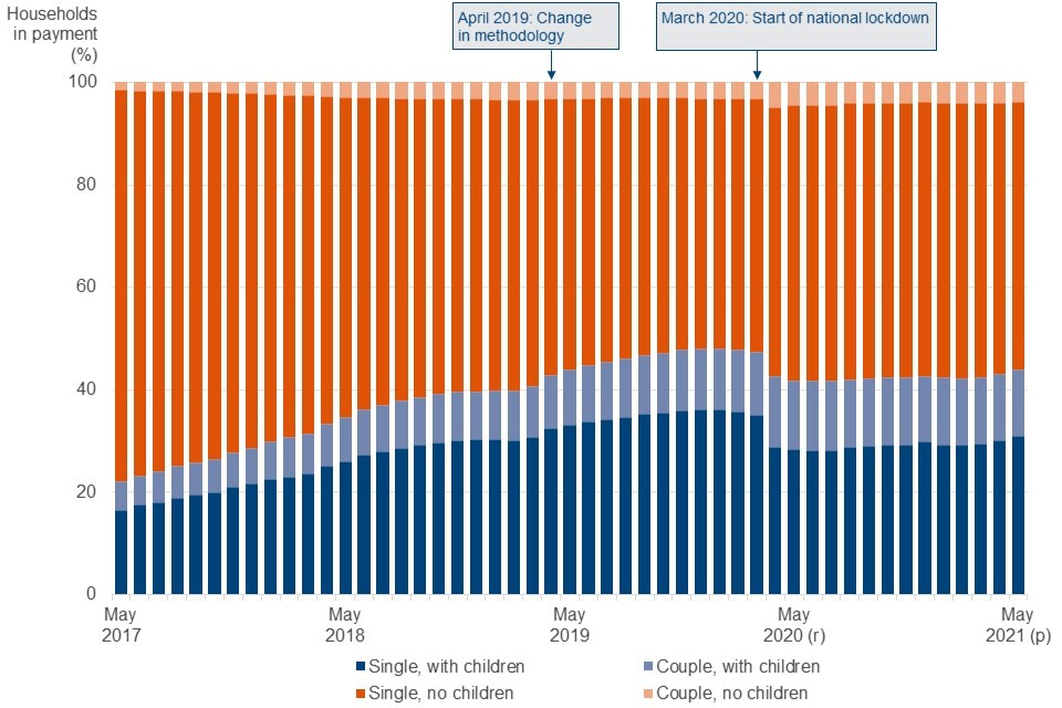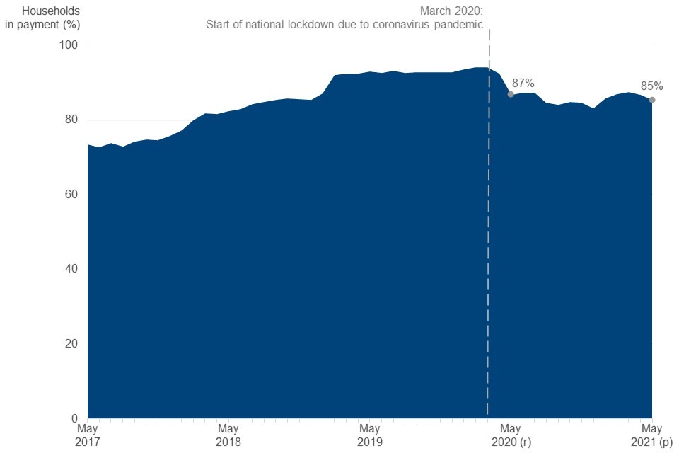 Households receiving their full payment on time for all claims in payment has continued an upward trend throughout the coronavirus pandemic. Of households in payment, 97% received all their payment on time in April 2021. This is an increase from 95% in April 2020.