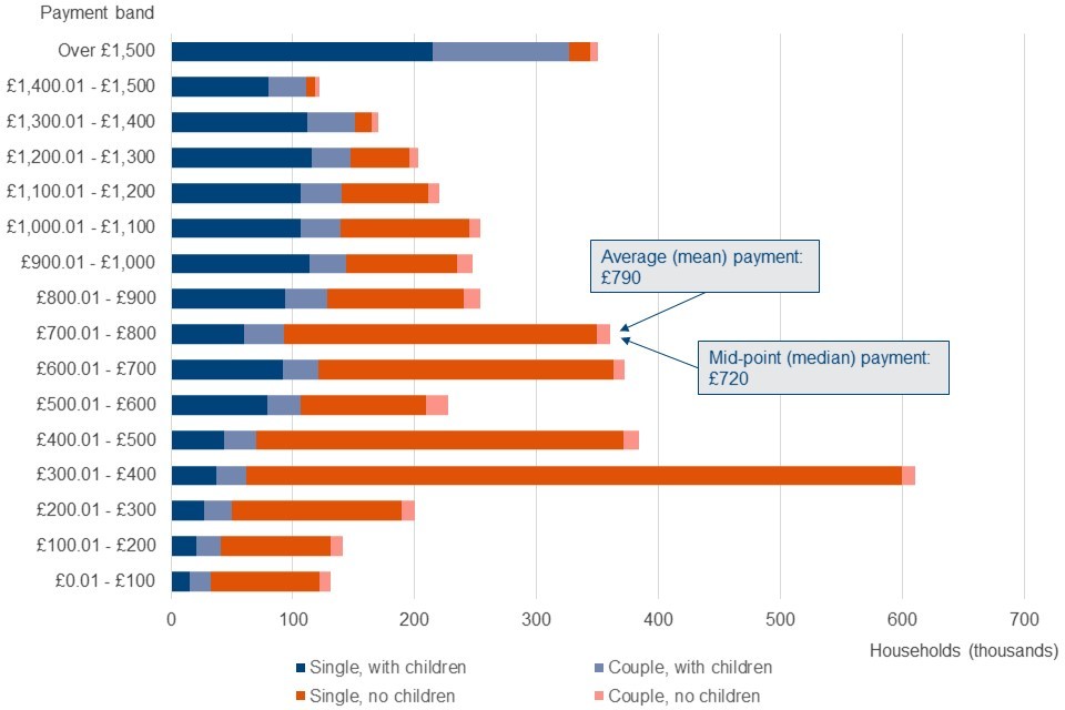 - Households: the number of households who have a calculated entitlement for Universal Credit for the monthly assessment period active on the count date (2nd Thursday of the month). The commentary for households in this bulletin focuses mostly on households who are “in payment” which is defined as households with a monthly award or advance payment of more than £0.