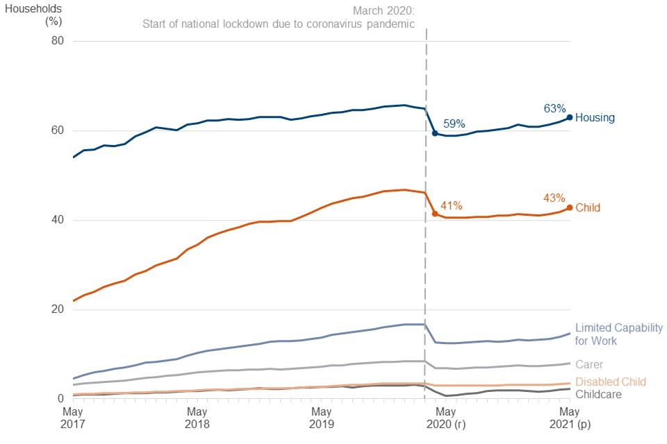 The number of people on Universal Credit who were working and earning enough not to have any work-related requirements as a condition of their claim (‘working – no requirements’) has risen by 150,000 to 1.2 million (21% of all people on Universal Credit) in July 2021 from 1.1 million (18% of all people on Universal Credit) in April 2021.