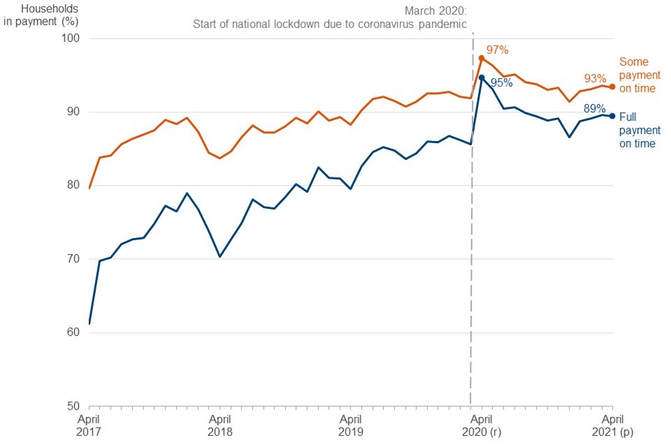 Nearly all households in payment (99%) were paid all or some payment on time in April 2021.