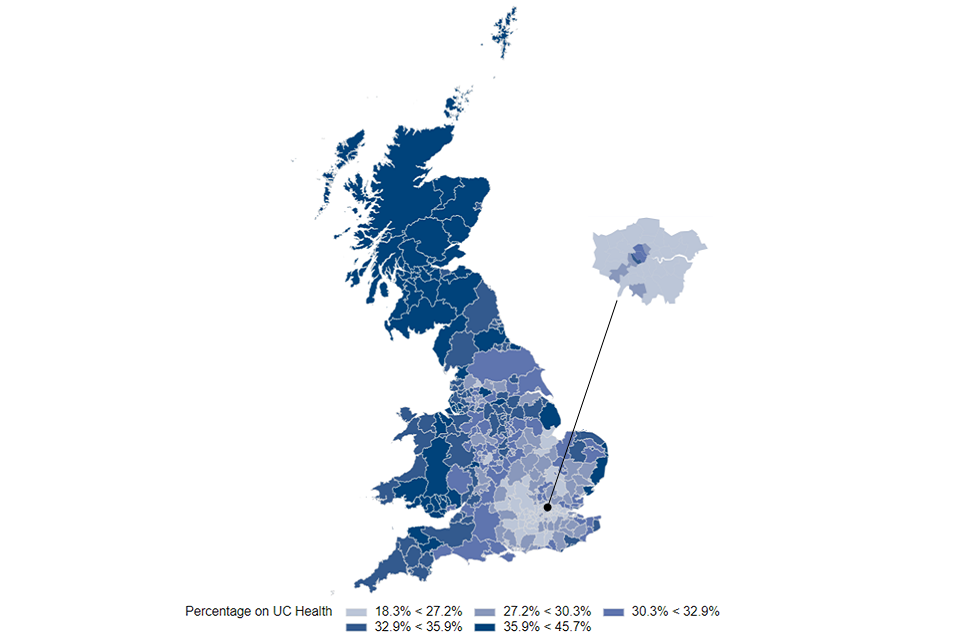 Over 60% of local authorities have over 30% of UC claimants on UC health.