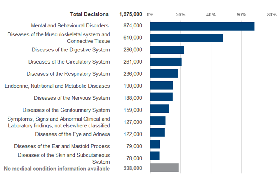 - 48% are recorded with diseases of the musculoskeletal system and connective tissue. This proportion is higher (60%) for claimants found to have No Limited Capability for Work