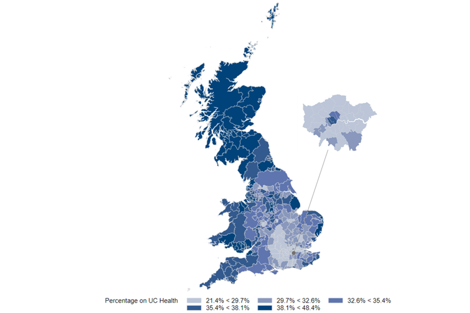 Over 78% of local authorities have over 30% of UC claimants on UC health.