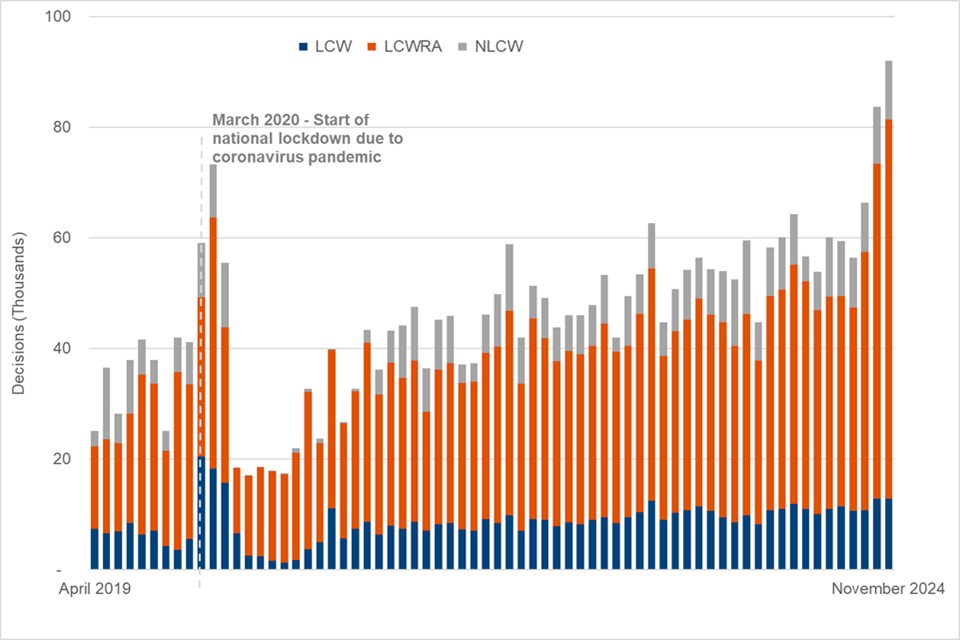 In the quarter to November 2024, 73% of UC WCA decisions were for LCWRA, up from 62% in the quarter to November 2023.