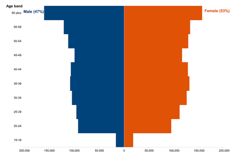 At June 2024, 53% of those on UC health were female. Of all claimants, 38% were aged 50 plus and 10% aged under 25.