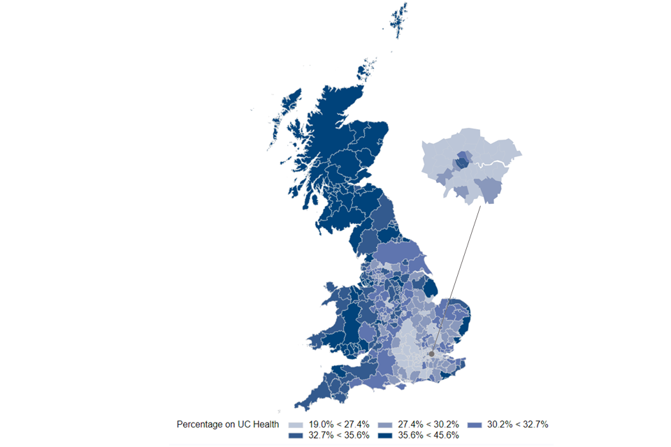 Over 64% of local authorities have over 30% of UC claimants on UC health.
