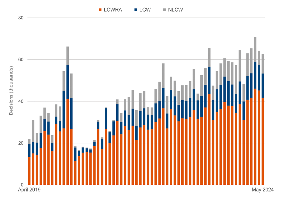 In the quarter to May 2024, 67% of UC WCA decisions were for LCWRA, up from 65% in the quarter to May 2023.
