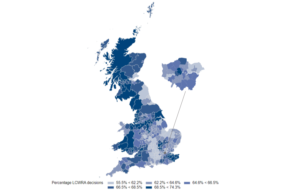 - within England, the region with the highest proportion of LCWRA decisions was the North-West (69%) and the lowest the North-East (61%)