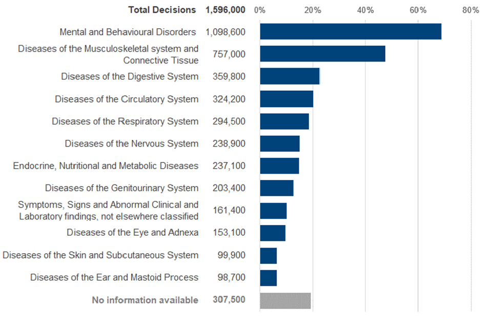 - Of all WCA decisions in the period January 2022 to May 2024, at least 69% of WCA decisions are recorded as having mental and behavioural disorders albeit this may not be their primary medical condition.