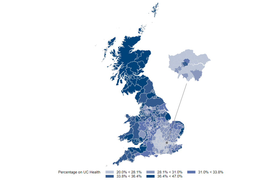 Over 64% of local authorities have over 30% of UC claimants on UC health.