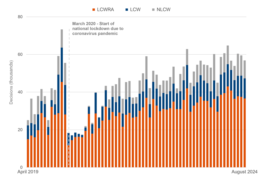 - 2.9 million UC WCA decisions have been made in the period from April 2019 to August 2024. 15% of decisions found claimants had no limited capability for work and hence no longer on UC health, 19% limited capability for work (LCW), and 66% limited capability for work and work-related activity (LCWRA)