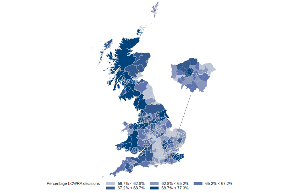 The region with the highest proportion of LCWRA decisions was Wales (69%) and the lowest the North-East (61%).