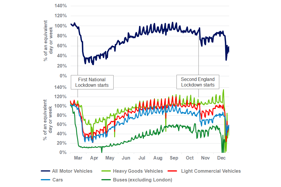 In March 2020 there was a sudden drop in traffic levels for all motor vehicles which recovered slowly. A drop is also seen in November but this was not as large. Heavy goods vehicles were least affected. Buses (excluding London) were most affected.