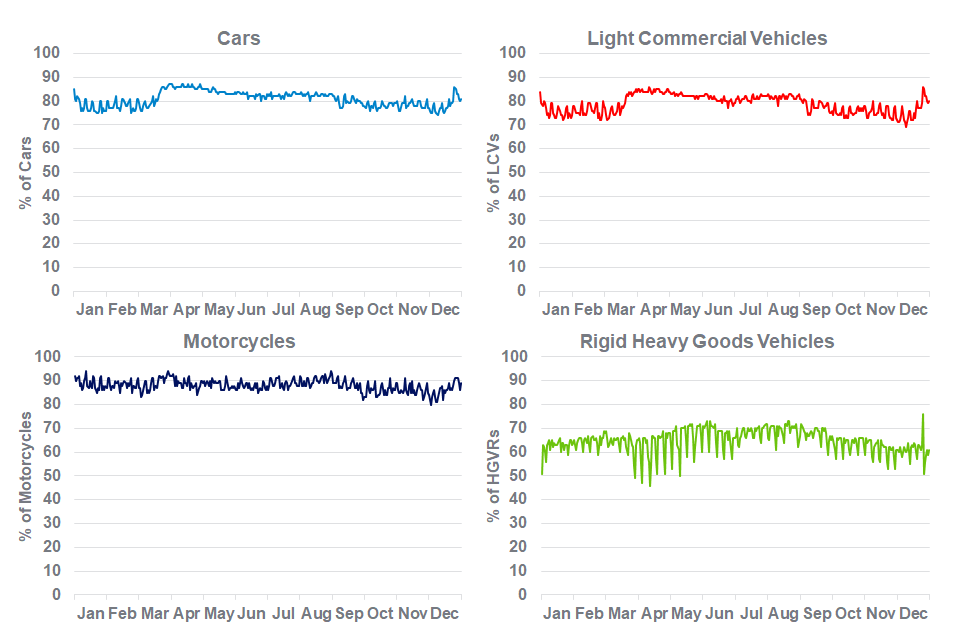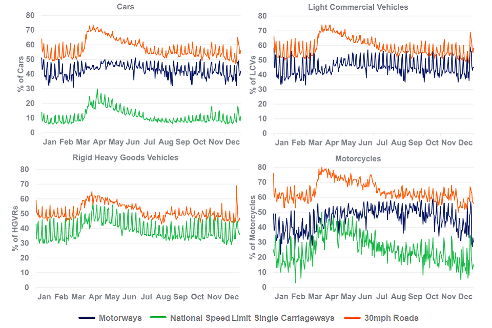 The trends in speed limit compliance presented can often be seen to coincide with these exceptional changes in road traffic, this can be seen in (Figure 2). Generally during periods of reduced traffic speed limit exceedances have been higher on most vehicle types, though it should be noted that other factors such as changes in season and weather may also have been having an impact.