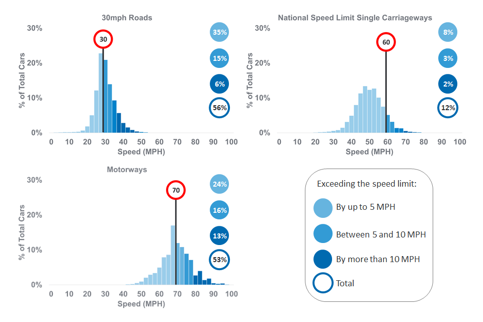 Under free-flowing conditions, the proportions of cars complying with the speed limit were 47% on motorways, 88% on national speed limit (NSL) single carriageways and 44% on 30mph roads.