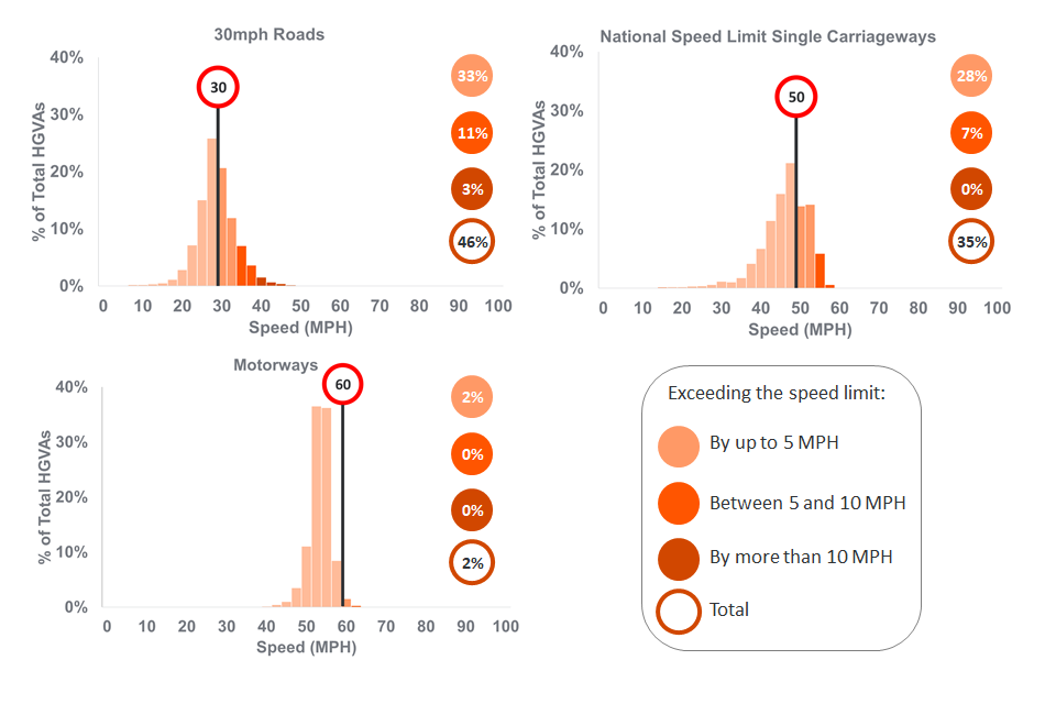 The proportion of articulated HGVs exceeding the speed limit by over 10mph on 30mph roads was 3%, while less than 1% exceeded the speed limit by more than 10mph on motorways and NSL single carriageway roads.