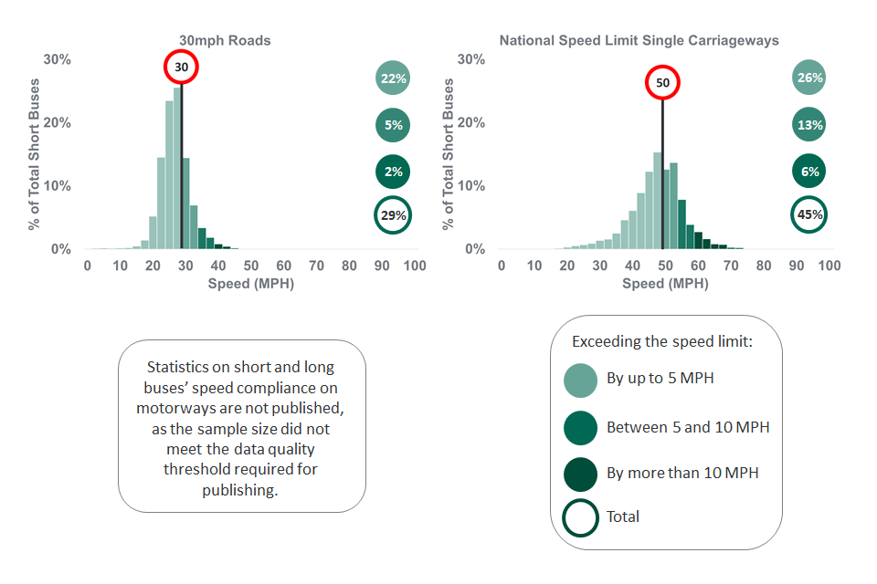In free-flow conditions, the proportions of short buses exceeding the speed limit was 45% on NSL single carriageways and 29% on 30mph roads.