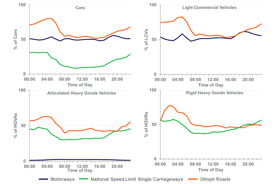 On motorways, 2% of articulated HGVs exceeded the speed limit, compared to 35% on NSL single carriageway roads and 46% on 30mph roads.