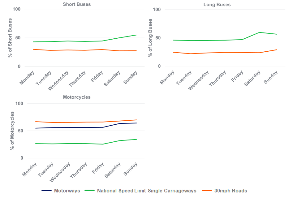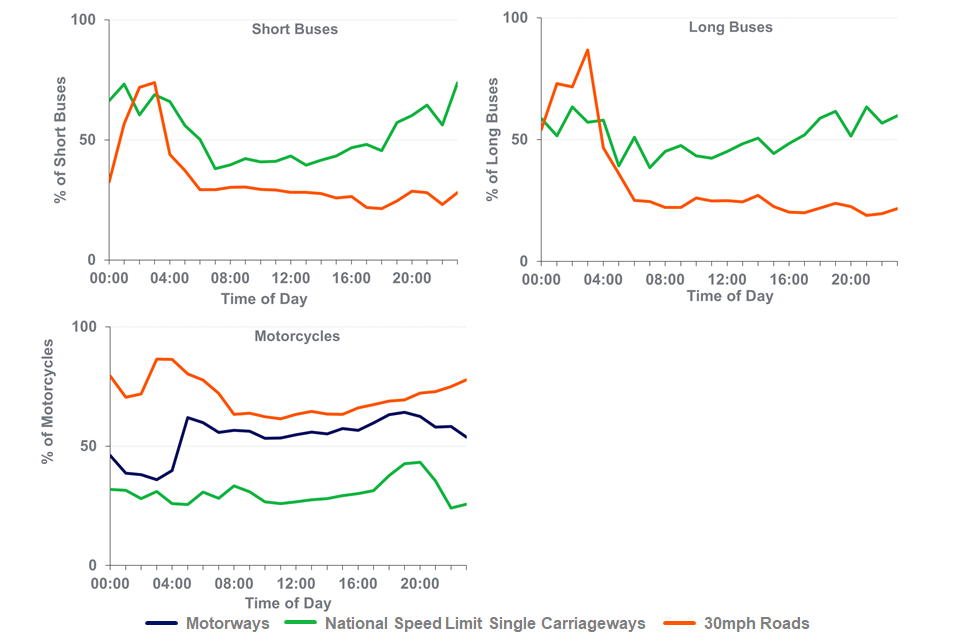 In free-flow conditions, the proportions of short buses (under 12m) complying with the speed limit were 55% on NSL single carriageway and 71% on 30mph roads.