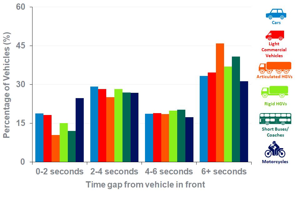 A time gap of 6 seconds and above was seen in a higher % of all vehicle types compared to lower time gaps. A time gap of between 0 and 2 seconds was seen in the lowest % of vehicles.