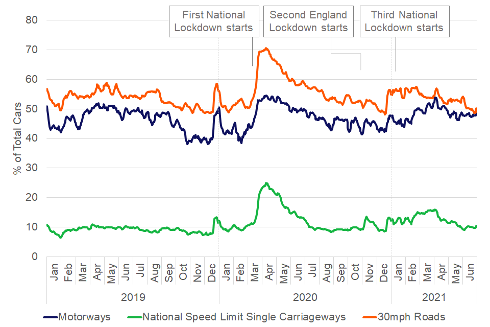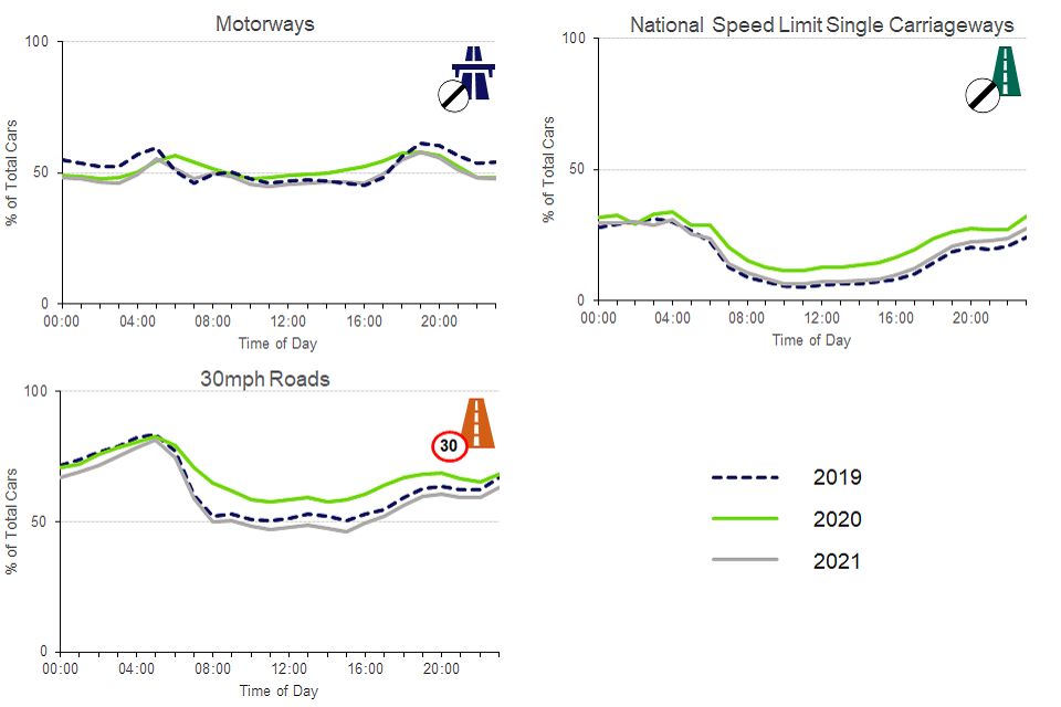 - on motorways, the reduction in speed limit exceedance usually seen during the morning and evening rush hour periods returned to levels seen in 2019