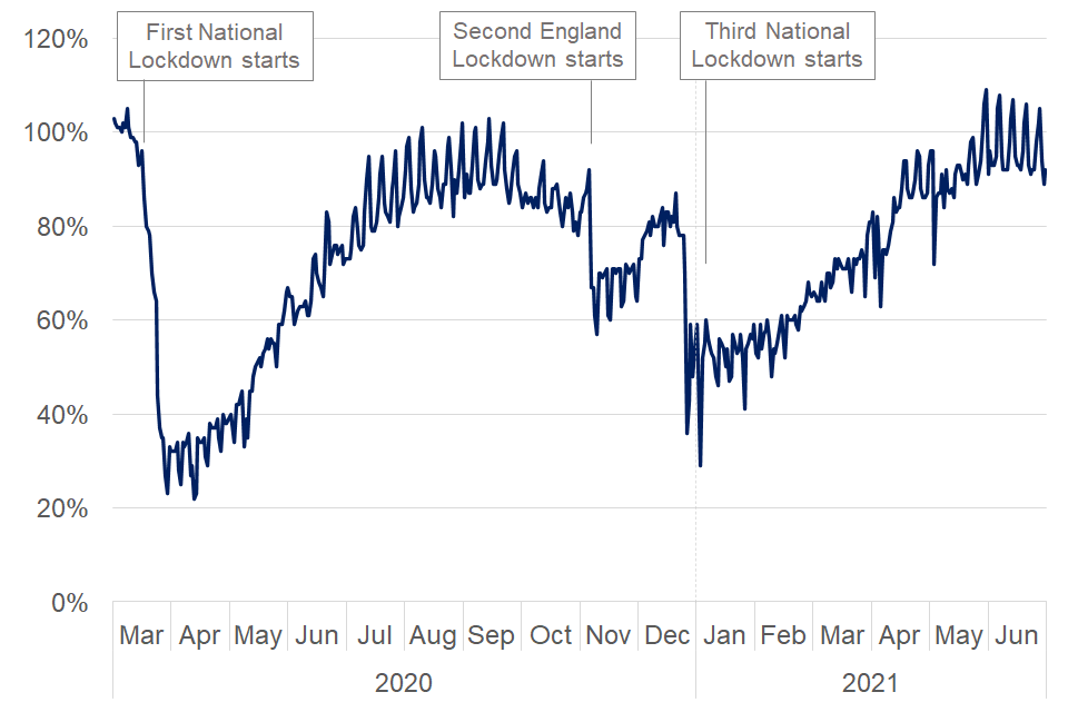 January 2021 saw England enter a third national lockdown and Scotland a second national lockdown while Wales continued its third national lockdown, which had begun in December 2020. These lockdowns again significantly reduced daily traffic levels, however, traffic levels remained higher than those seen in April to June 2020. By June 2021, overall road traffic levels had returned to levels close to those seen before the pandemic.
