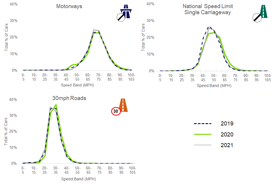 On motorways and 30mph roads, 2021 showed similar speed distributions to 2019 and 2020. On National Speed Limit Single Carriageways, 2021 showed similar speed distributions to 2019, with 2020 showing a higher proportion of cars speeding.