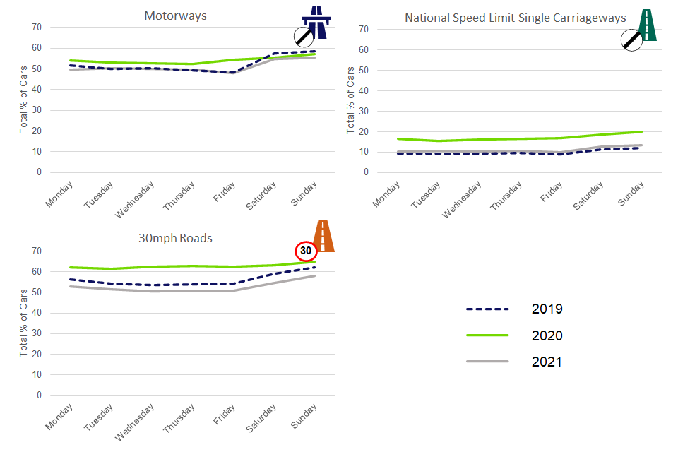 - on 30 mph roads, the proportion of cars exceeding the speed limit on weekdays and weekends was lower when compared to the same periods in 2020 and 2019