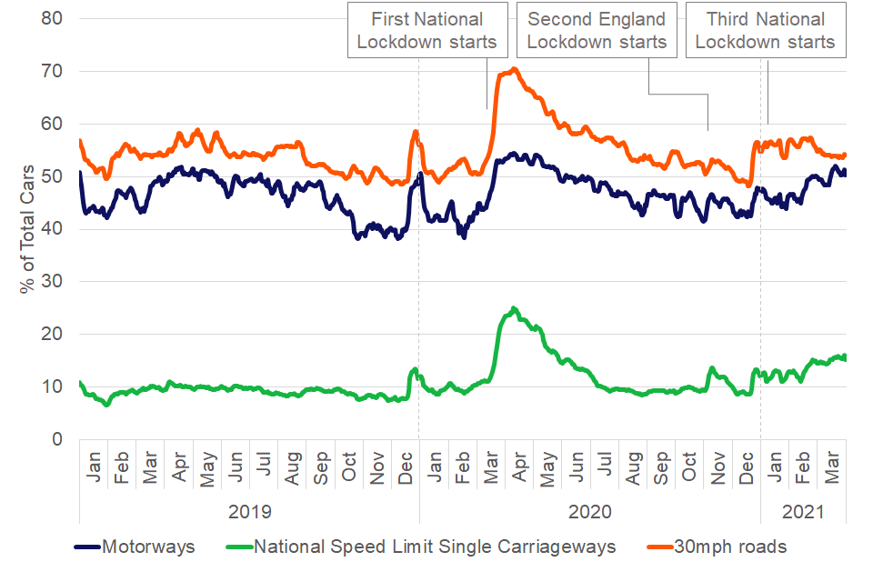 Only broad-scale comparisons of patterns in compliance and speeds over time periods of 5 or more years can be made confidently, unless the changes are large and the context is clear. This release covers January to March 2021 and therefore cannot be directly compared to annual publications. Quarterly statistics in 2019 and 2020 are provided throughout the release for comparative purposes.