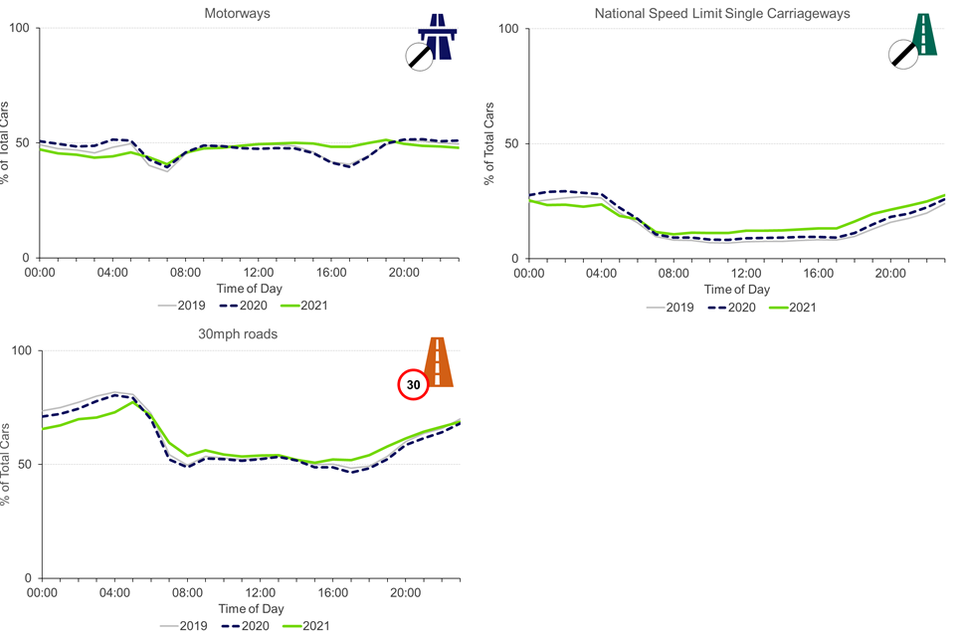 - on all road types, the proportion of cars exceeding the speed limit on weekdays was higher than the same periods in 2020 and 2019
