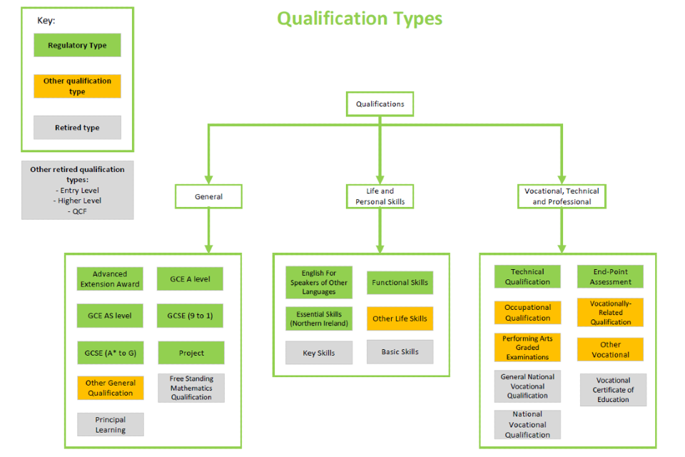 Ofqual revised the list of qualification types in consultation with awarding organisations and the new structure of qualification types is given in figure 1. In the new structure, we removed qualification types that did not identify a coherent group of qualifications and also cut across other types or described a qualification using other information in the regulatory framework. We added types where necessary to cover the broadest range of qualifications that we regulate. No changes were made for those qualifications where there are qualification specific regulatory requirements. This includes, but is not limited to, GCSEs, GCEs (AS and A levels), Functional Skills, and end-point assessments.