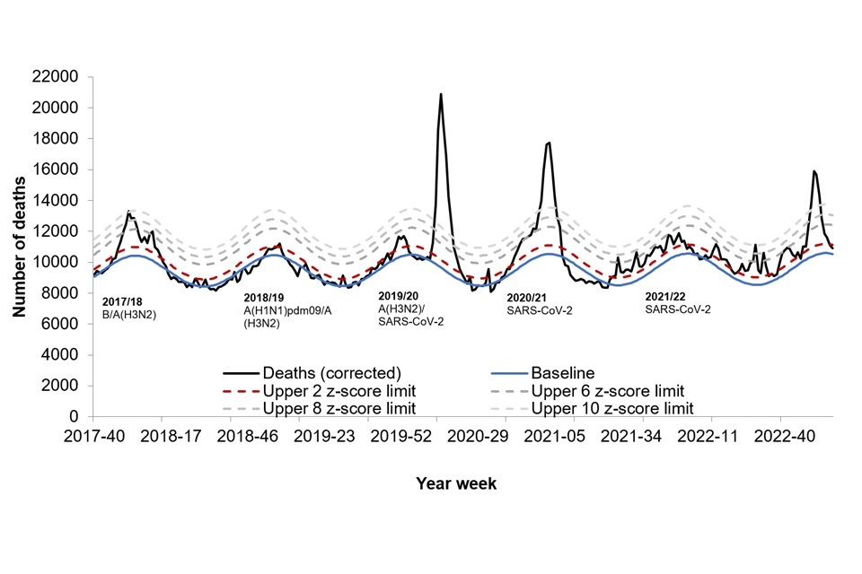 The coronavirus (COVID-19) pandemic period is excluded from the baseline thresholds calculation. Excess mortality triggers further investigation of spikes and informs any public health responses.