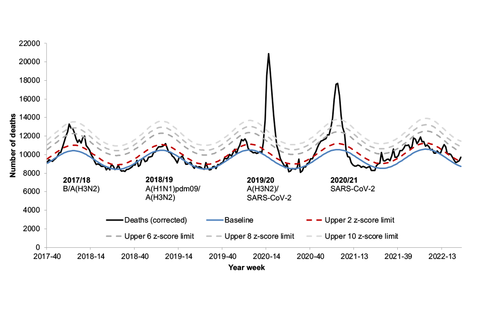 The coronavirus (COVID-19) pandemic period is excluded from the baseline thresholds calculation. Excess mortality triggers further investigation of spikes and informs any public health responses.
