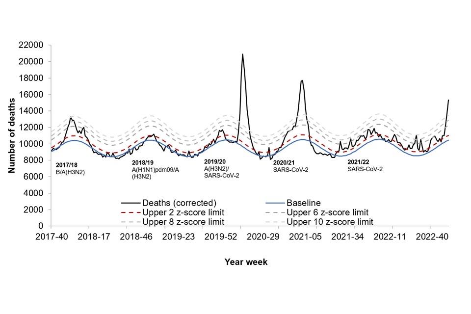 The coronavirus (COVID-19) pandemic period is excluded from the baseline thresholds calculation. Excess mortality triggers further investigation of spikes and informs any public health responses.