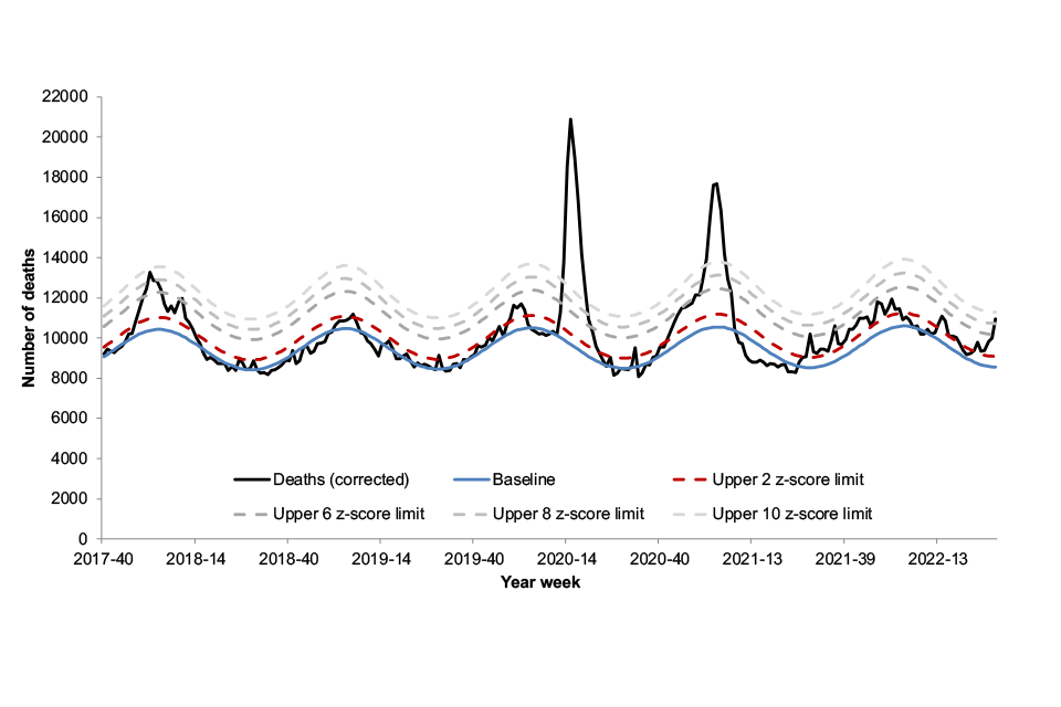This weekly mortality surveillance aims to detect and report acute significant weekly excess mortality above normal seasonal levels in a timely fashion. Excess mortality is defined as a significant (above the upper 2 z-score threshold) number of deaths reported over that expected for a given point in the year, allowing for weekly variation in the number of deaths. A z-score is a statistical measure of how many standard deviations above the baseline threshold the number of deaths were. For example, a z-score of 2 means that the number of deaths were 2 standard deviations above the baseline threshold.