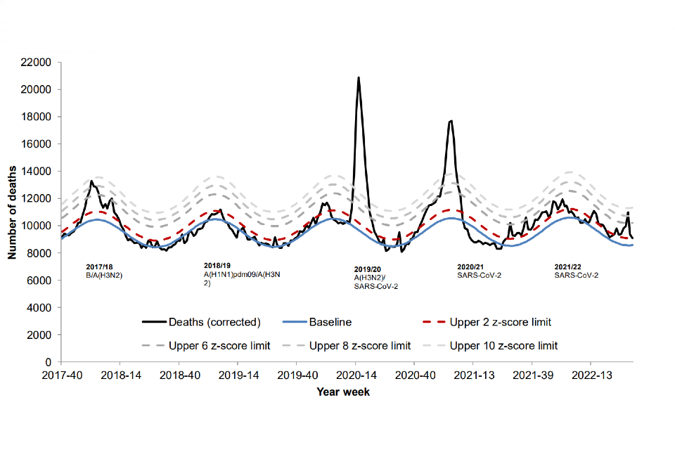 The coronavirus (COVID-19) pandemic period is excluded from the baseline thresholds calculation. Excess mortality triggers further investigation of spikes and informs any public health responses.
