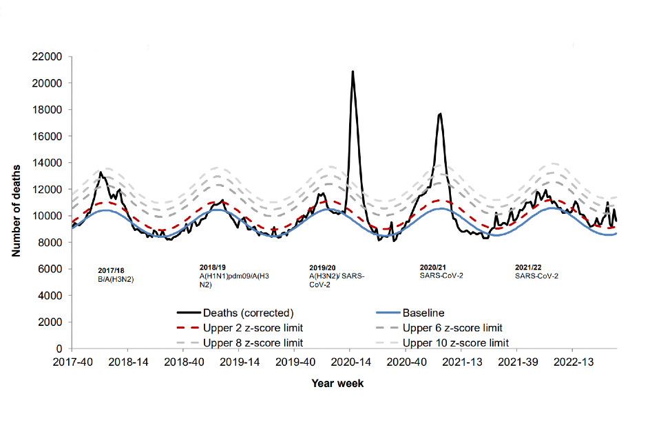 The coronavirus (COVID-19) pandemic period is excluded from the baseline thresholds calculation. Excess mortality triggers further investigation of spikes and informs any public health responses.