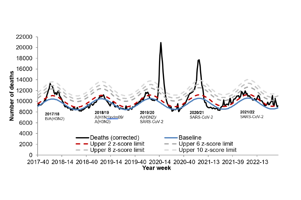 The coronavirus (COVID-19) pandemic period is excluded from the baseline thresholds calculation. Excess mortality triggers further investigation of spikes and informs any public health responses.