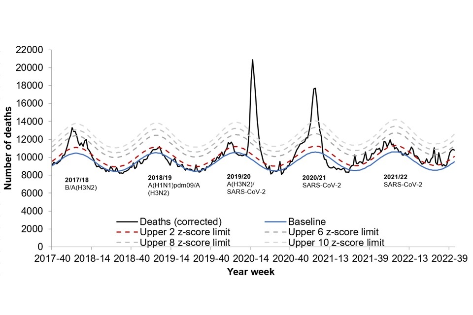 The coronavirus (COVID-19) pandemic period is excluded from the baseline thresholds calculation. Excess mortality triggers further investigation of spikes and informs any public health responses.