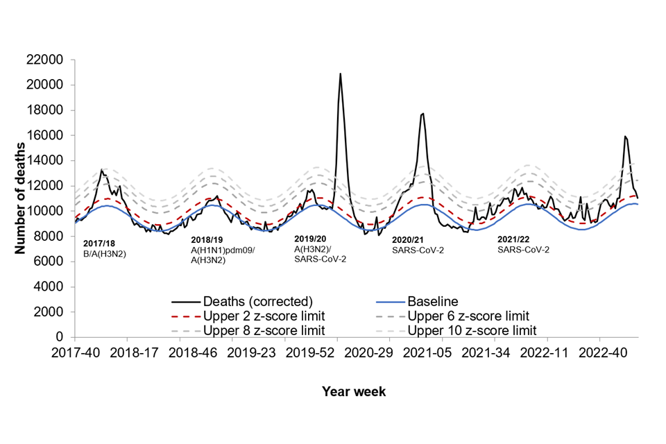 The coronavirus (COVID-19) pandemic period is excluded from the baseline thresholds calculation. Excess mortality triggers further investigation of spikes and informs any public health responses.