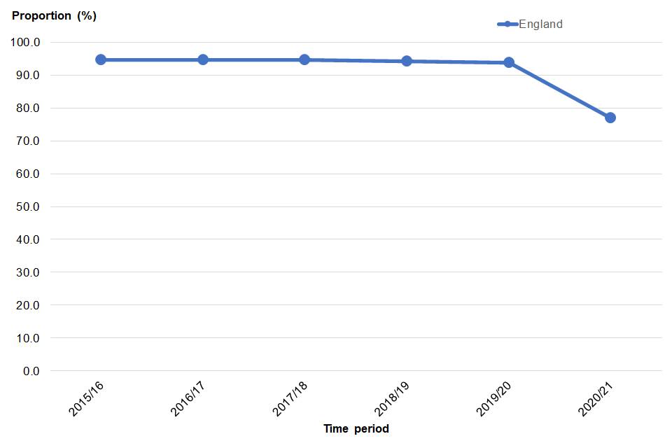 This indicator measures the percentage of people who successfully obtained an NHS dental appointment out of those who tried in the last 2 years, based on data from the GP Patient Survey (GPPS). In financial year 2020 to 2021, during the COVID-19 pandemic period, the England value was 77%, a significant decrease since financial year 2019 to 2020 (from 93.7% to 77.0%, a decrease of 16.7 percentage points). Prior to financial year 2020 to 2021, the percentage of those successfully obtaining an NHS dental appointment remained stable, with almost 95% of people being successful in each year.