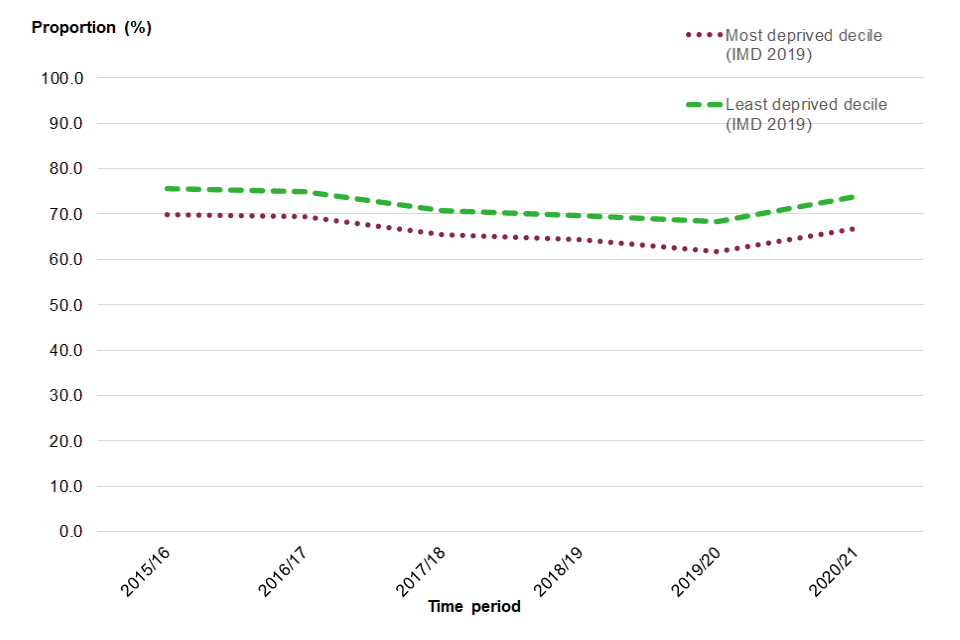 This indicator aims to capture the experience of patients of accessing GP services, based on data from the GP Patient Survey (GPPS). It is measured as the percentage of people who report their experience of making a GP appointment as ‘fairly good’ or ‘very good’. In financial year 2020 to 2021, the England value was 70.7%, an increase from 65.5% in financial year 2019 to 2020. Deprivation decile group 10 (least deprived) reported the best experience of making a GP appointment, with 73.9% of people reporting a fairly good or very good experience. Deprivation decile group 1 (most deprived) had the lowest proportion of people reporting a fairly good or very good experience of making a GP appointment at 66.8%.