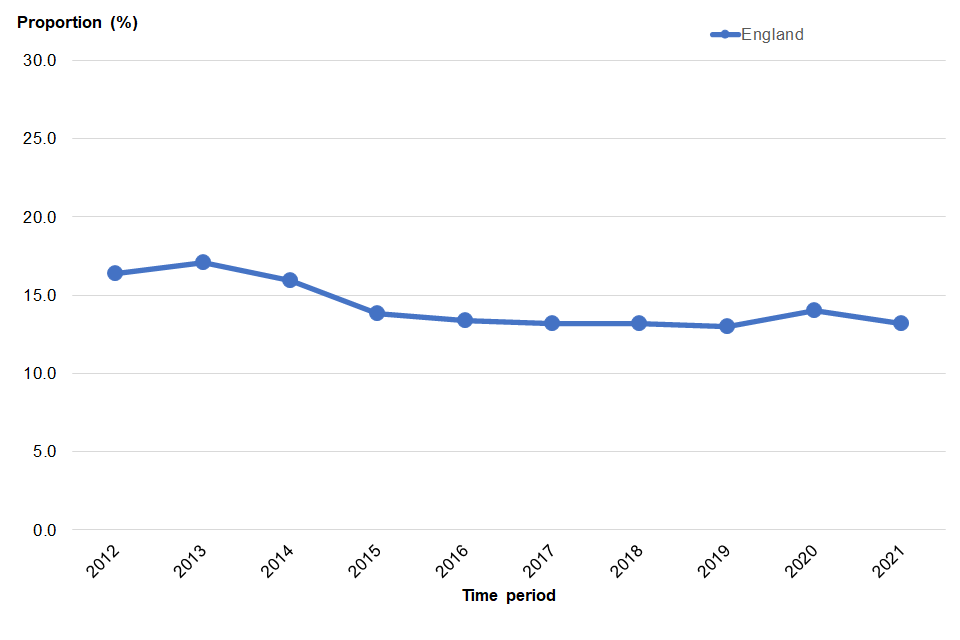 Figure 3: proportion of people 19 to 24 NEET, 2012 to 2021, England