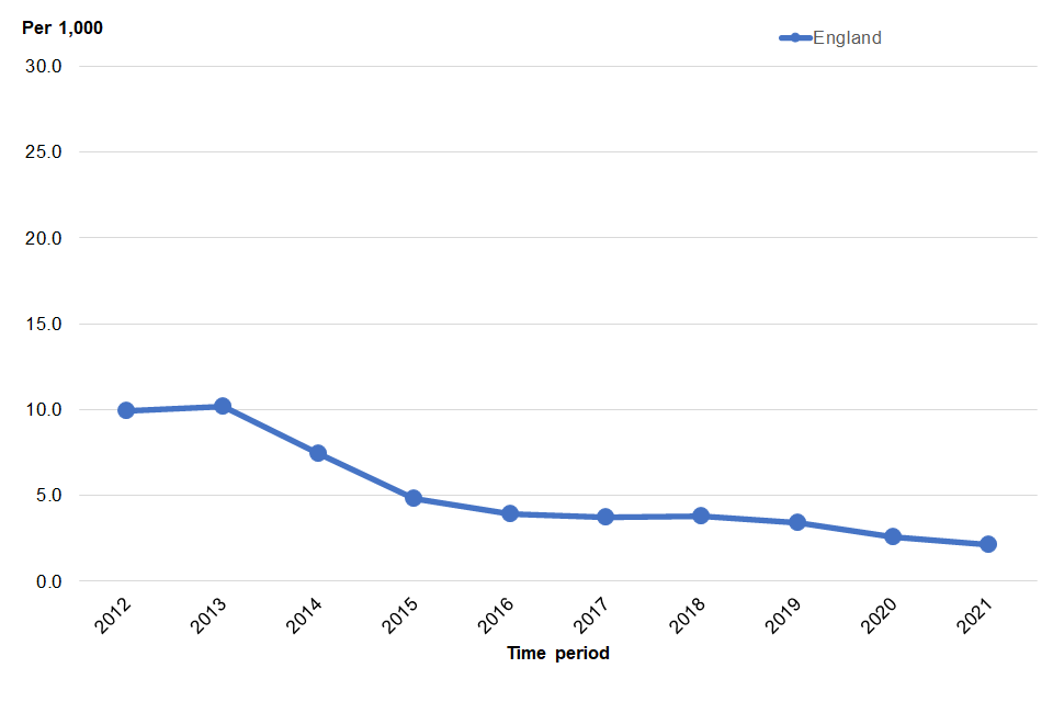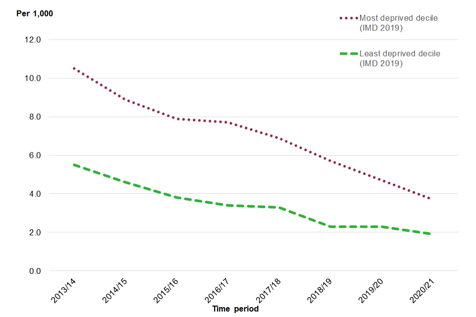 The rate of children aged 10 to 17 years entering the youth justice system was 2.8 per 1,000 children in financial year 2020 to 2021, significantly lower than financial year 2019 to 2020 (3.5 per 1,000 children) and continuing a long-term downward trend. The gap between the rate of children entering the youth justice system in the most deprived decile of areas compared with the least deprived is narrowing. It is possible that the pandemic has had some effect on the system during periods of restrictions, such as court closures, pauses to jury trials and remote hearings. Furthermore, changes to people’s behaviour, including reduced social contact may have had an effect on the number of proven offences.