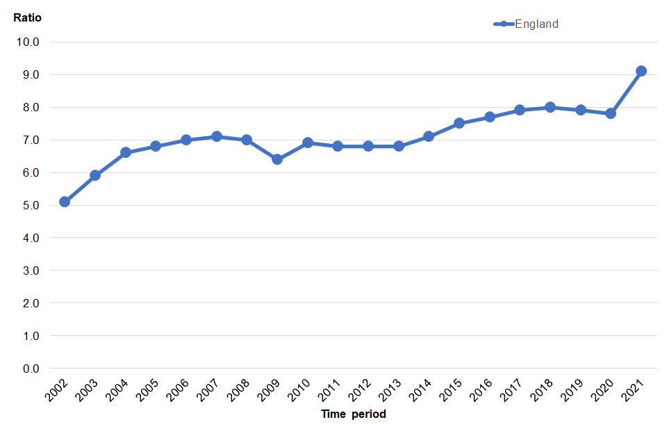 In England in 2021, full-time employees could expect to spend 9.1 times their workplace-based annual earnings on purchasing a home. This is a big increase since 2020, when this ratio was 7.8 times.