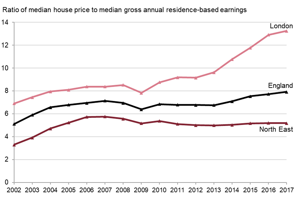 Line chart showing the ratio of median house price to median gross annual residence-based earnings over time for London, England and the North East, between 2002 and 2017