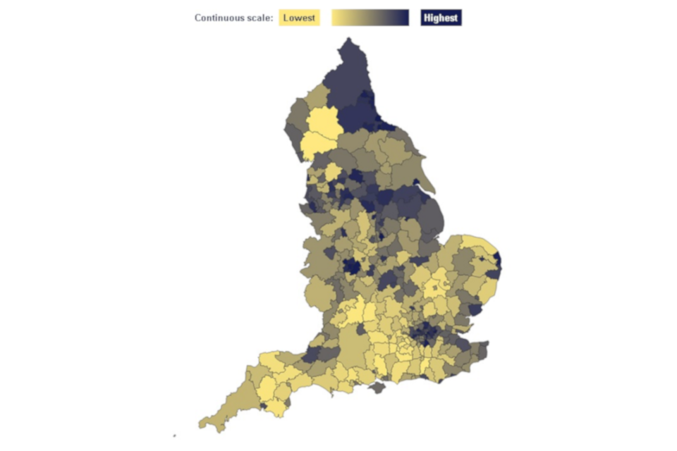 Map of England showing variation by local authority of the rate of unemployment in 2017, shaded to show a continuous scale of the rate of unemployment for each local authority, from the lowest to the highest